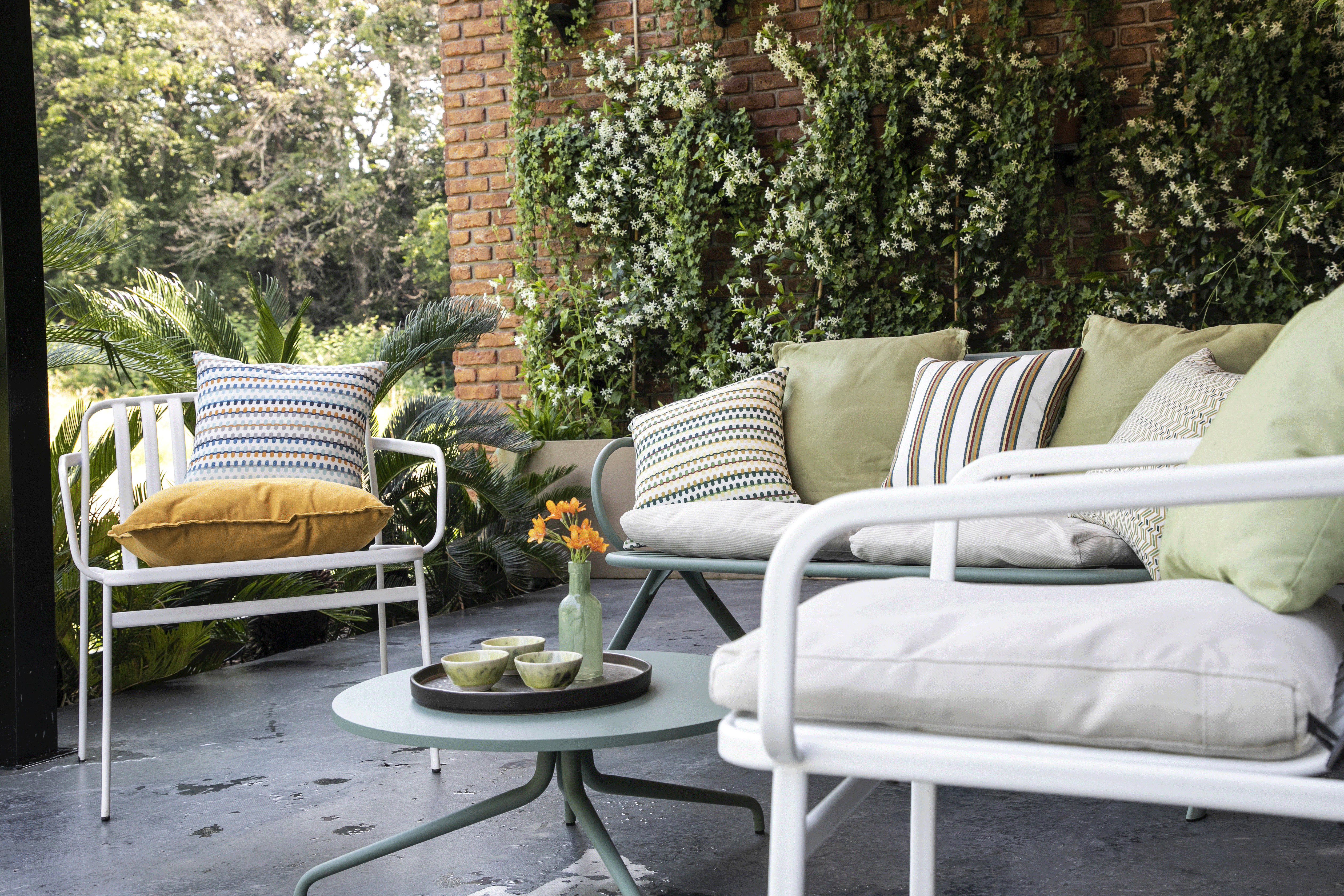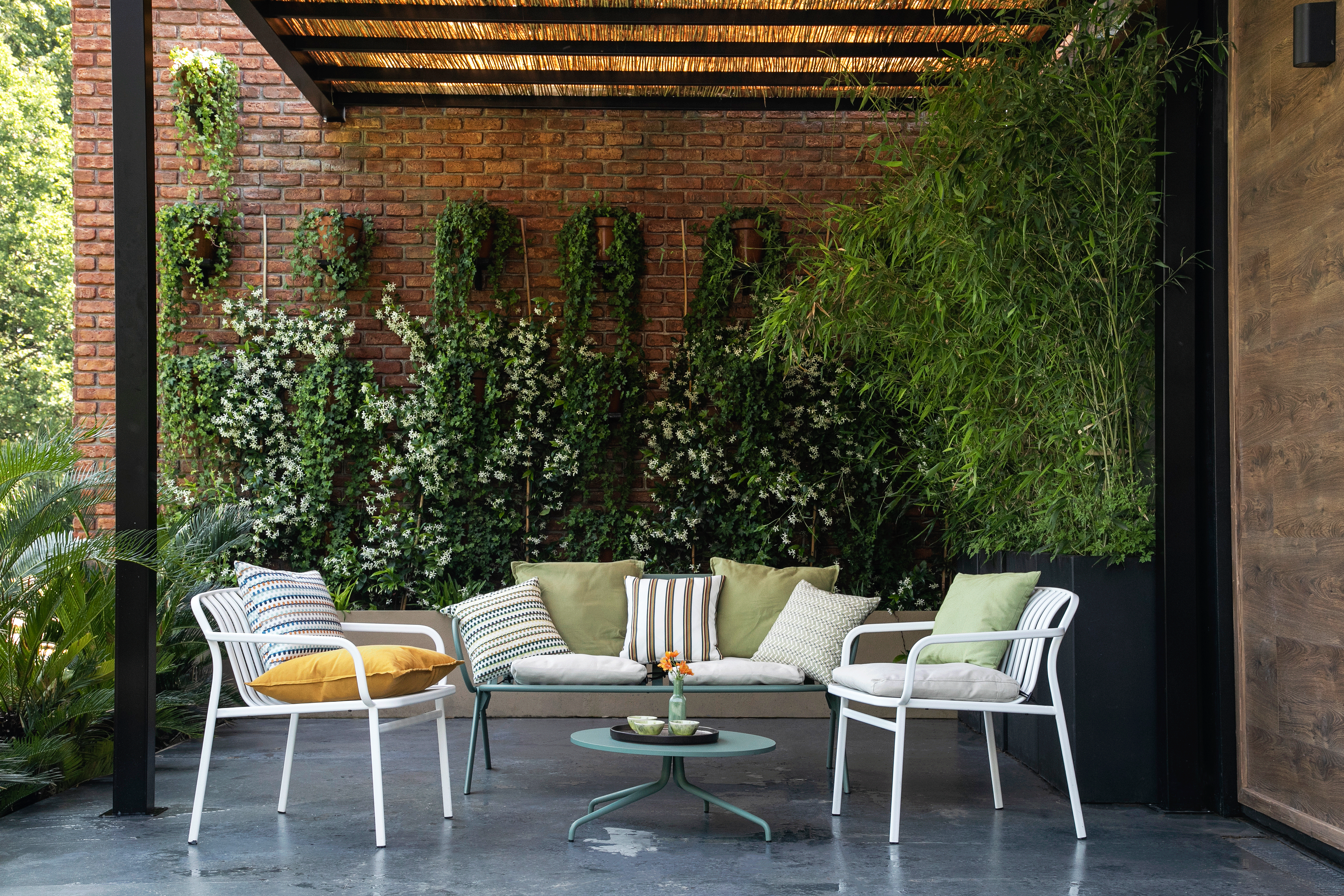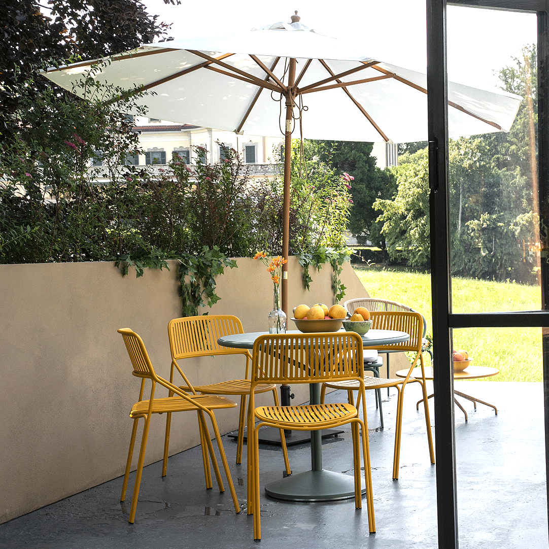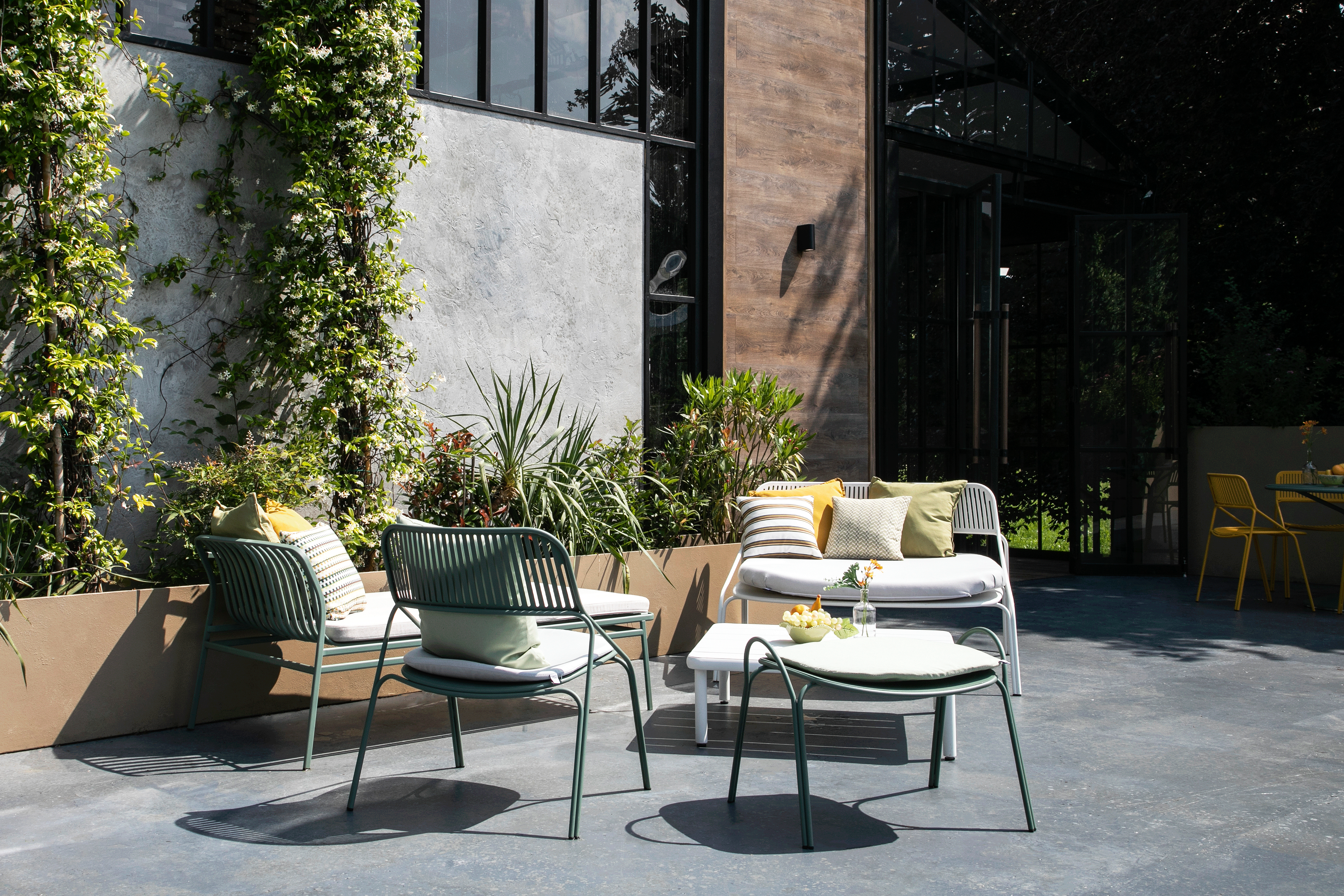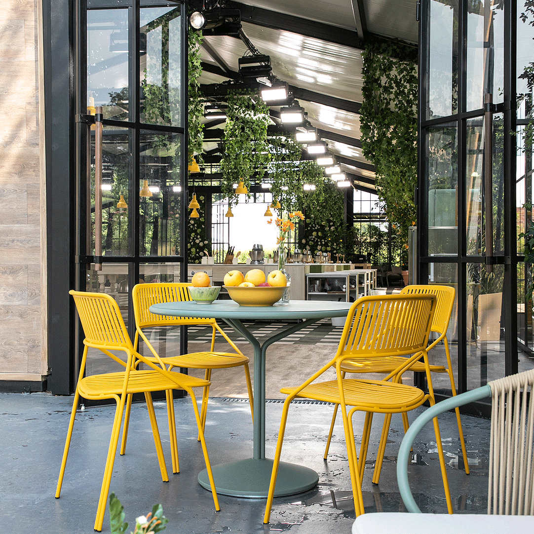 Sulla terrazza riservata ai concorrenti troviamo le sedie, il tavolo rotondo, il day bed, la poltroncina e il pouf JOS, le sedie da pranzo e il tavolo basso KISSI e le poltroncine KANO.