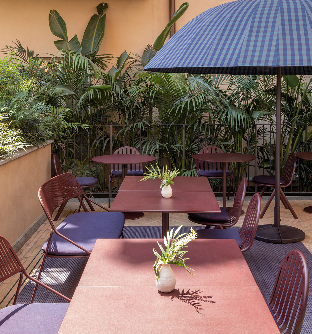 Sulla terrazza al primo piano si trovano, per scelta dell’architetto Alessia Garibaldi, le sedie MELIK disegnate da BrogliatoTraverso, le poltroncine e i divani JOS e i tavoli GAO bistrot disegnati da Simone Bonanni. Tutti gli arredi sono stati realizzati in versioni custom per soddisfare le specifiche esigenze dell’hotel e finiti con colori esclusivi selezionati da Alessia Garibaldi.